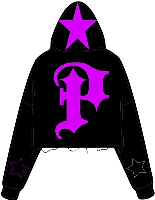 cropped and distressed hoodie with screen printed stars on sleeves and phrase "Mental" on top of hood and applique distress patched logos on front and back of hoodie with contrast stitching around neck and sleeves